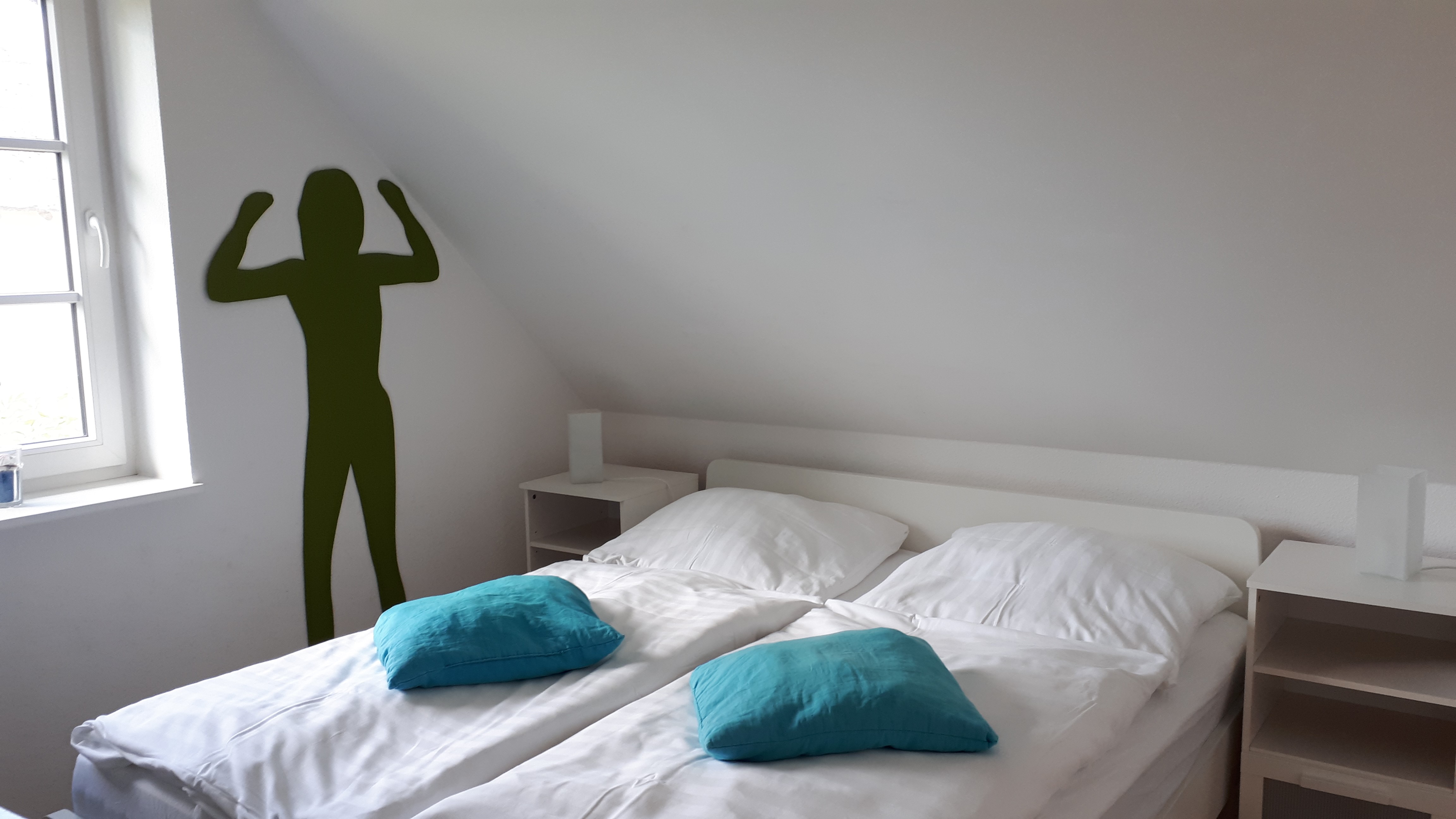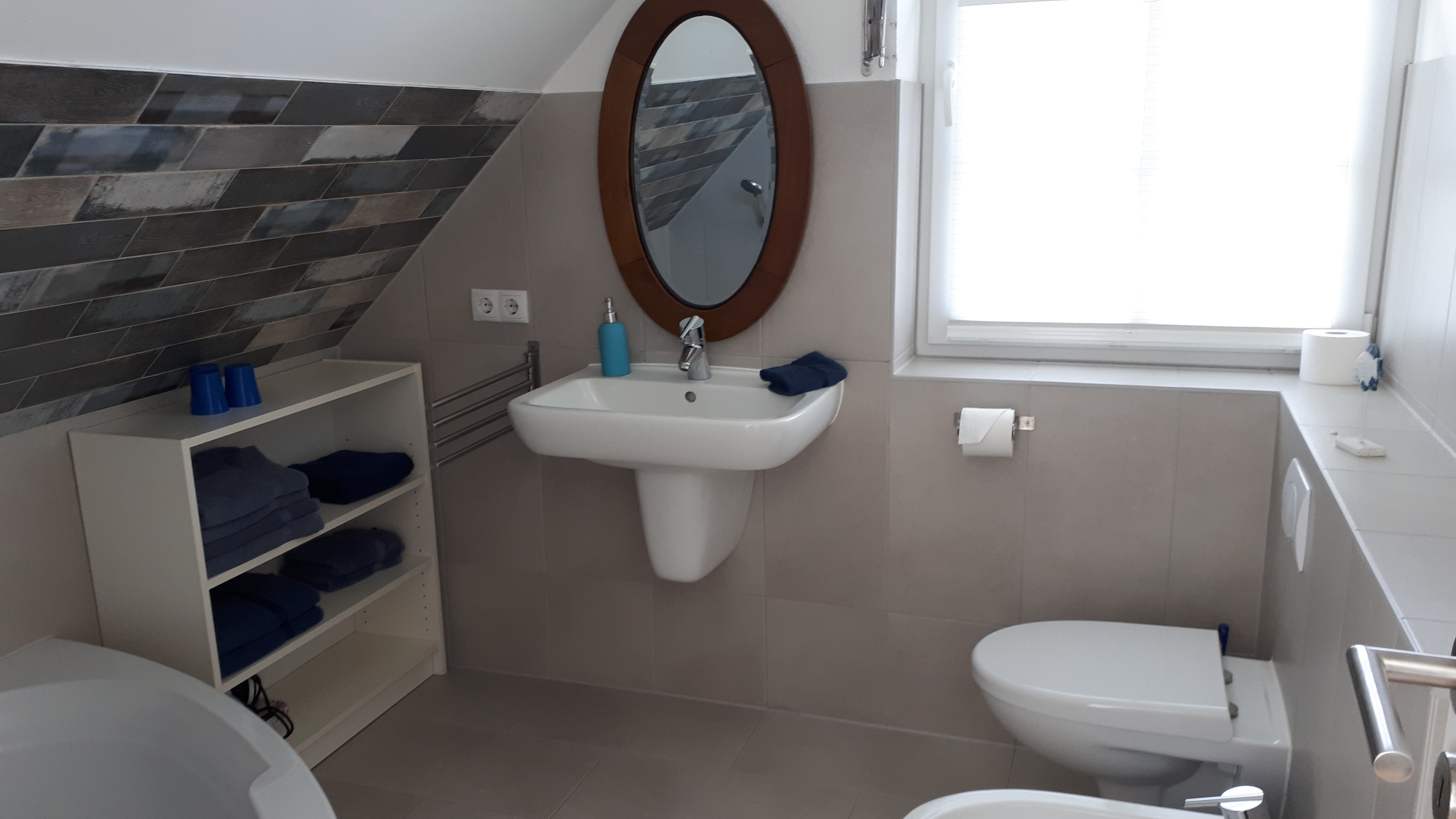Eine helle, hochwertig ausgestattete Maisonettewohnung mit innenliegender Verbindungs-treppe und ausreichend Platz für die große Familie oder Gruppe. Im Obergeschoss befinden sich die drei großzügigen Schlafzimmer mit jeweils einem Doppelbett – für die 7. Person ist eine gemütliche Schlafcouch vorhanden) sowie zwei Bäder, davon eines mit Badewanne und WC/Bidet und eines mit Dusche und WC/Bidet.
