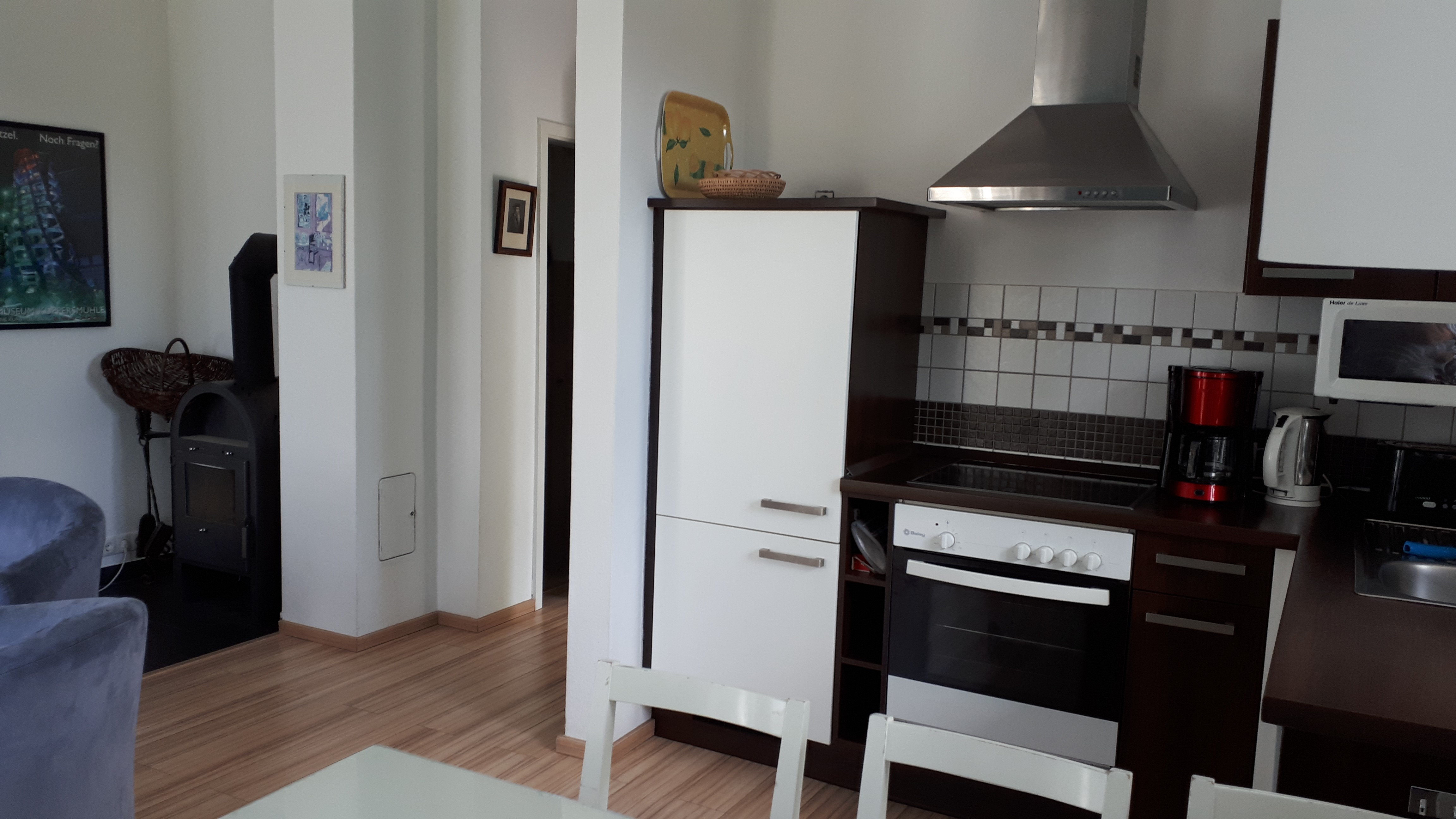 // Voll ausgestattete, moderne Küche mit Ceran-Kochfeld und Backofen, Dunstabzug, Geschirrspüler, Mikrowelle, Kaffeemaschine, Wasserkocher, Eierkocher und Toaster.
