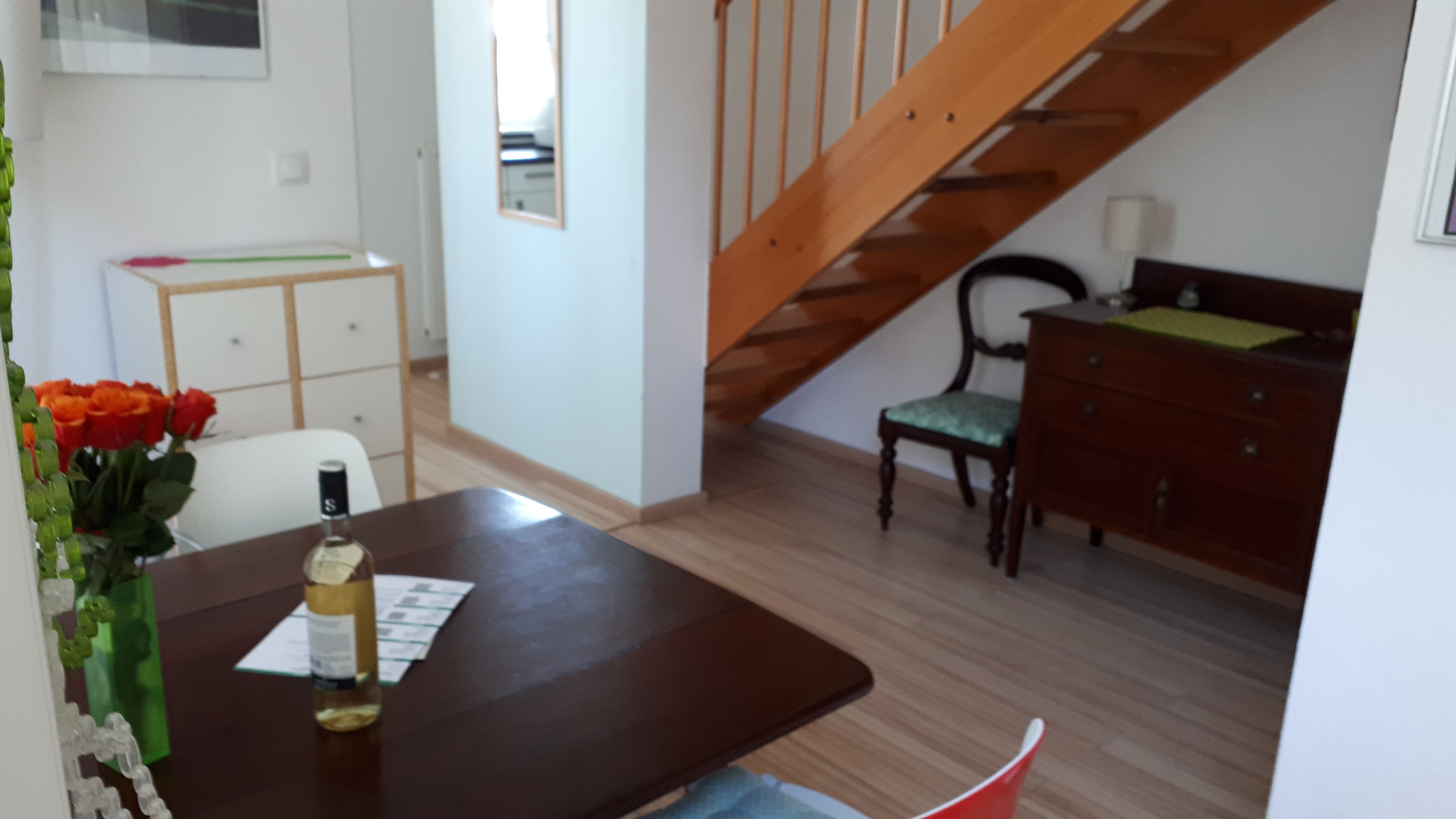 Die luxuriöse Wohnung erstreckt sich über zwei, mit eigener Treppe verbundene Ebenen. Im oberen Stockwerk befinden sich zwei behagliche Schlafzimmer, sowie ein Bad mit Dusche und WC. Im Erdgeschoss bieten das gemütliche Wohn-Esszimmer mit dem Kaminofen und die separate Küche eine ideale Ausgangslage für Ihre Tagesplanung. Ein weiteres Gäste-WC befindet sich im Erdgeschoss.