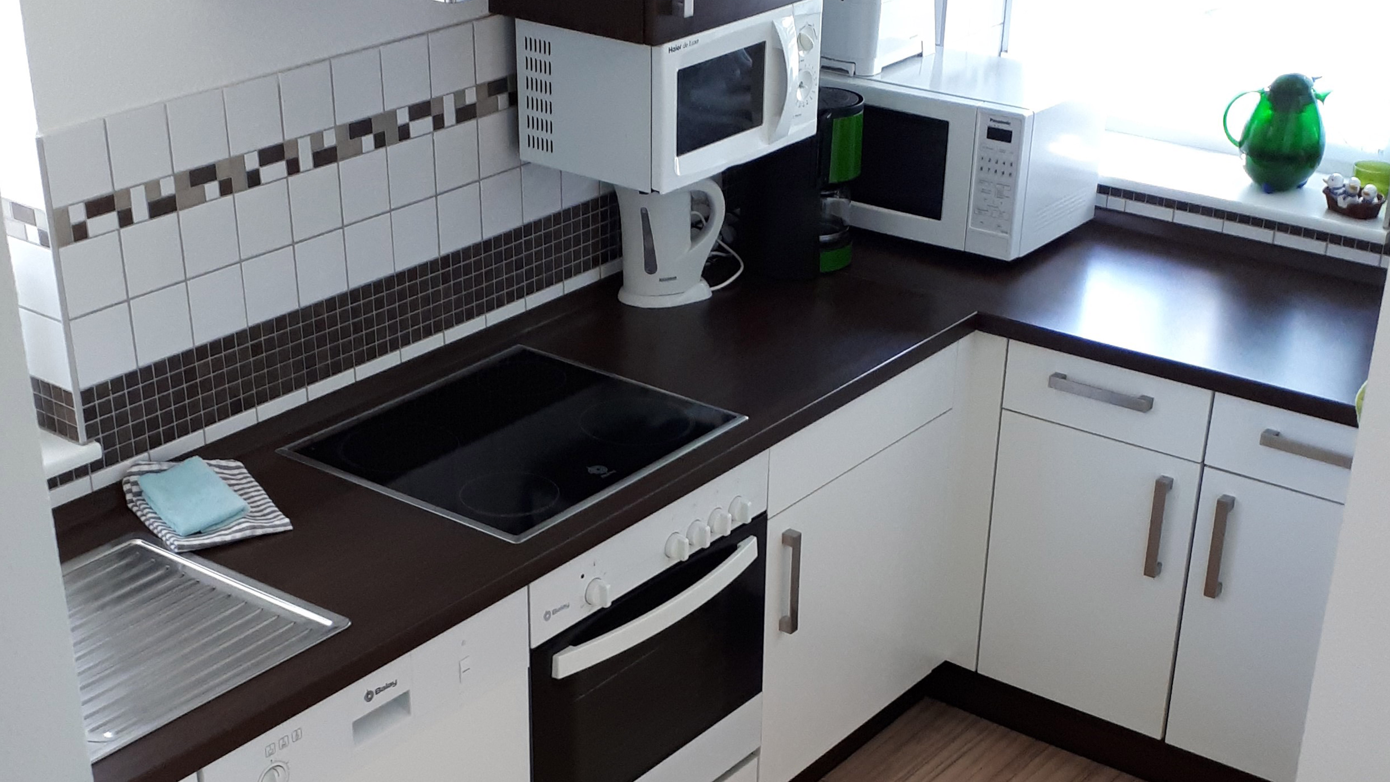 // Voll ausgestattete, moderne Küche mit Ceran-Kochfeld und Backofen, Dunstabzug, Geschirrspüler, Mikrowelle, Kaffeemaschine, Wasserkocher, Eierkocher und Toaster.