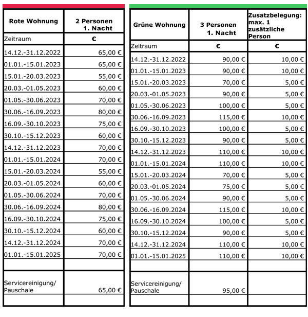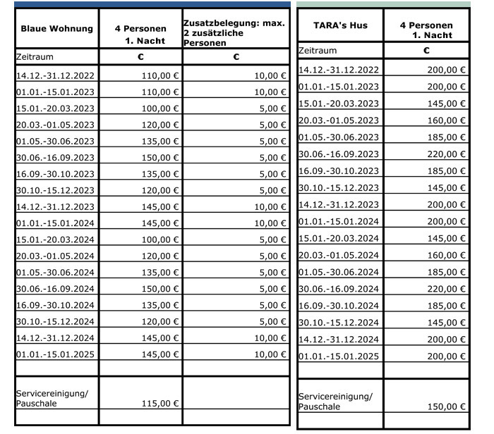 Bitte berücksichtigen Sie, dass in der Vor- und Nachsaison eine Mindestbuchzeit von 3 Tagen, in der Hauptsaison von 1 Woche besteht. Die Anreise ist ab 14:00h möglich, Abreise bis 11:00h, gegebenenfalls auch nach separater Vereinbarung. Alle Preise verstehen sich pro Nacht (inkl.Bettwäsche, Handtücher, Strom, Wasser) und inkl. Endreinigung.